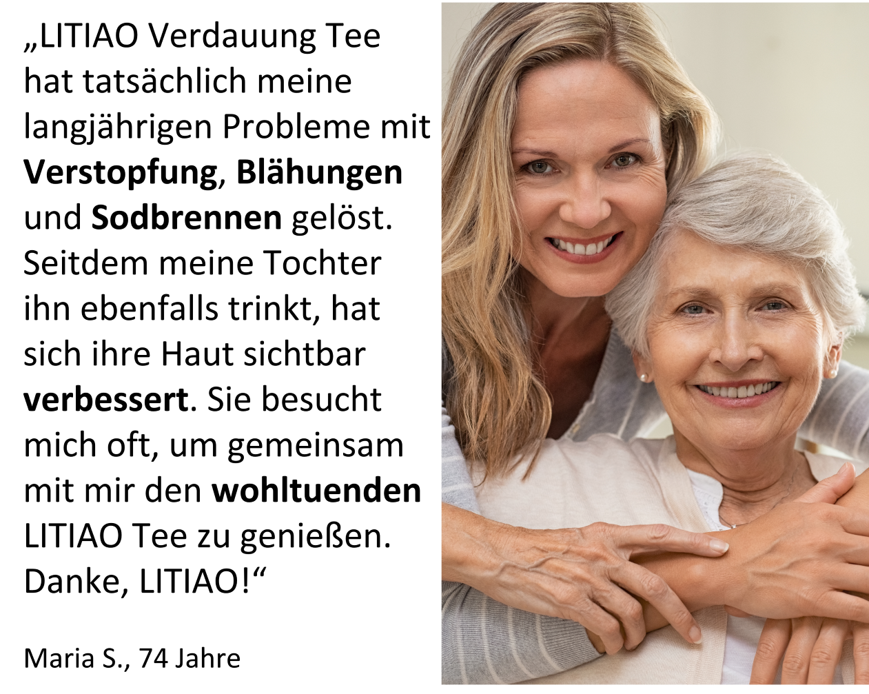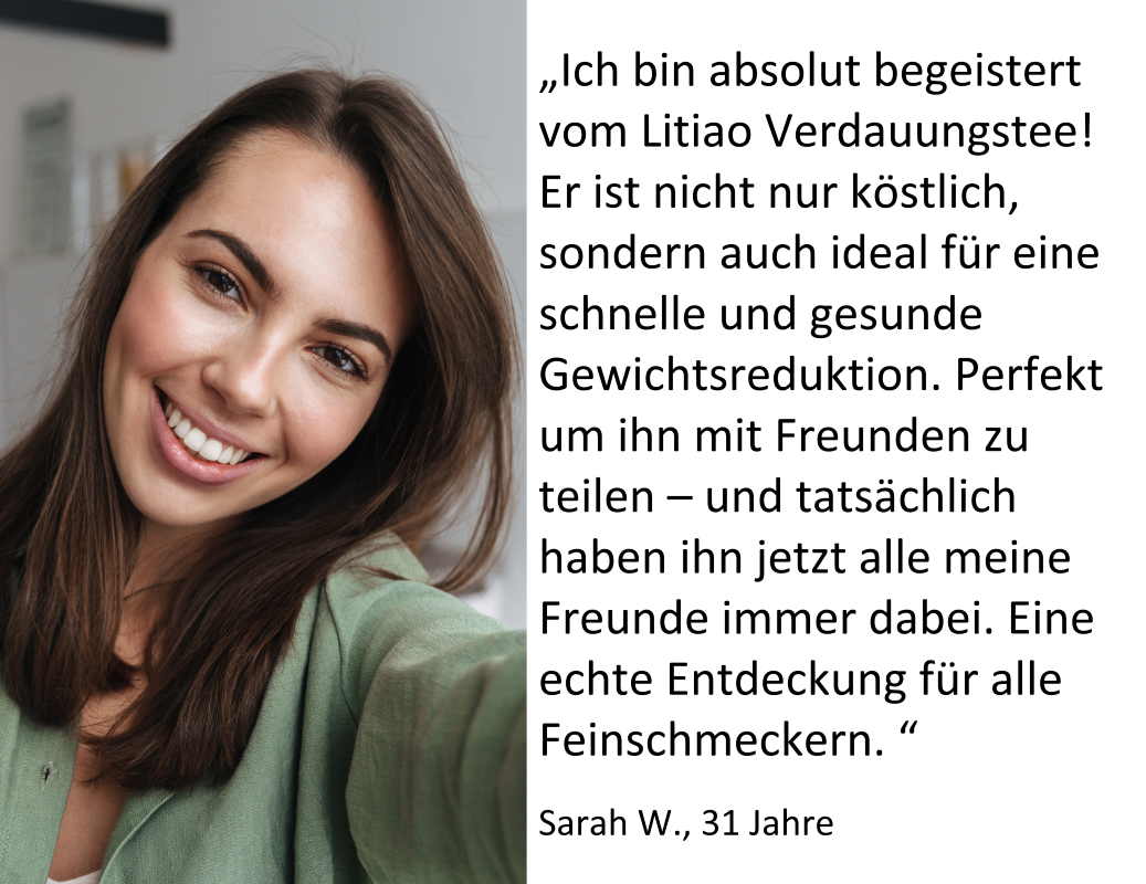"Dieser Tee ist ein wahrer Segen für meine Verdauung. Seit ich ihn trinke, habe ich viel weniger Sodbrennen und der Säurereflux ist fast vollständig verschwunden. Ich spüre eine deutliche Verbesserung und fühle mich energischer. Danke Litiao."
